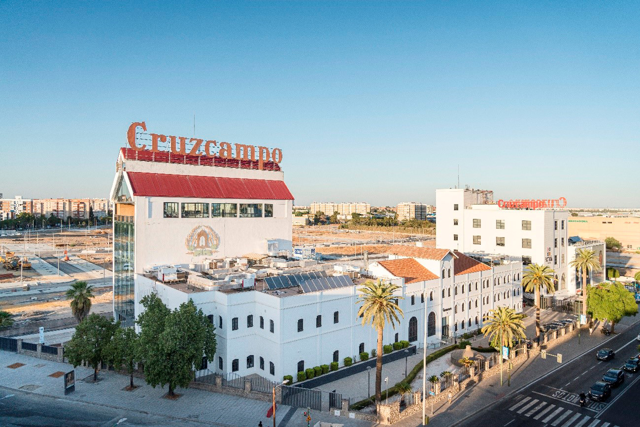 Founded in 1904, the Cruzcampo brewery was Seville’s first beer production facility. The complex comprises a series of industrial buildings inspired by Central European factory design from the Industrial Revolution. It features large windows to maximise natural light, a functional layout, a symmetrical design, and taller structures to accommodate machinery with easy access to transportation. Located in the vibrant Nervión neighbourhood, the complex includes three historic structures: Maestranza, the Cruzcampo Factory (formerly the “Mosaico” building), and Torre Cruzcampo (previously known as “Palomar”), all of which are listed among the city’s protected buildings.