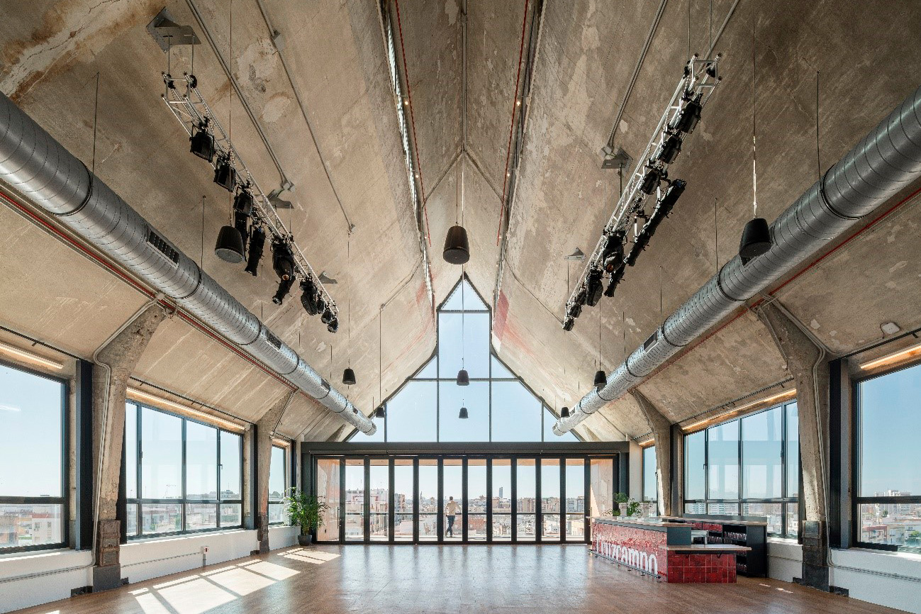 Ayesa’s approach involved fully emptying the old silo while preserving its original brick and concrete shell, which showcases its rich history and stains from gases during the fermentation process. Existing floor slabs were replaced to enhance the interior, increasing the ceiling height and eliminating central pillars. This critical alteration allows the space to be used for multiple needs, including classrooms and entrepreneurial spaces. This open-plan layout is improved by centralising access via double staircases and elevators in the service core at the back of the building. The top floor has a viewing platform for events and celebrations. It offers an ample, open space with a western-facing terrace providing clear views of Seville’s historic centre.