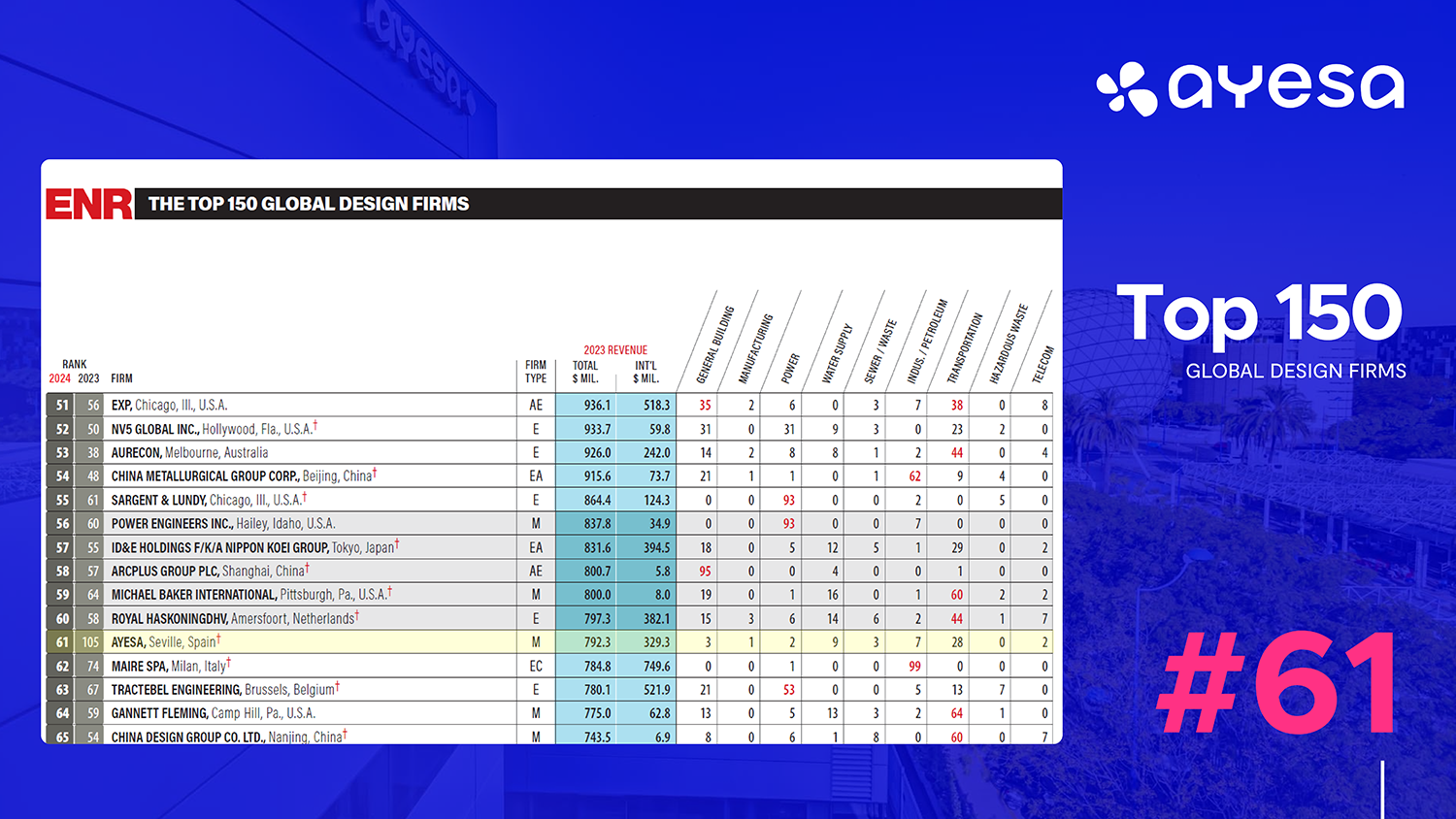 - Ayesa has significantly progressed in the Top 150 Global Design Firms, moving from #103 to #61 in 2024.