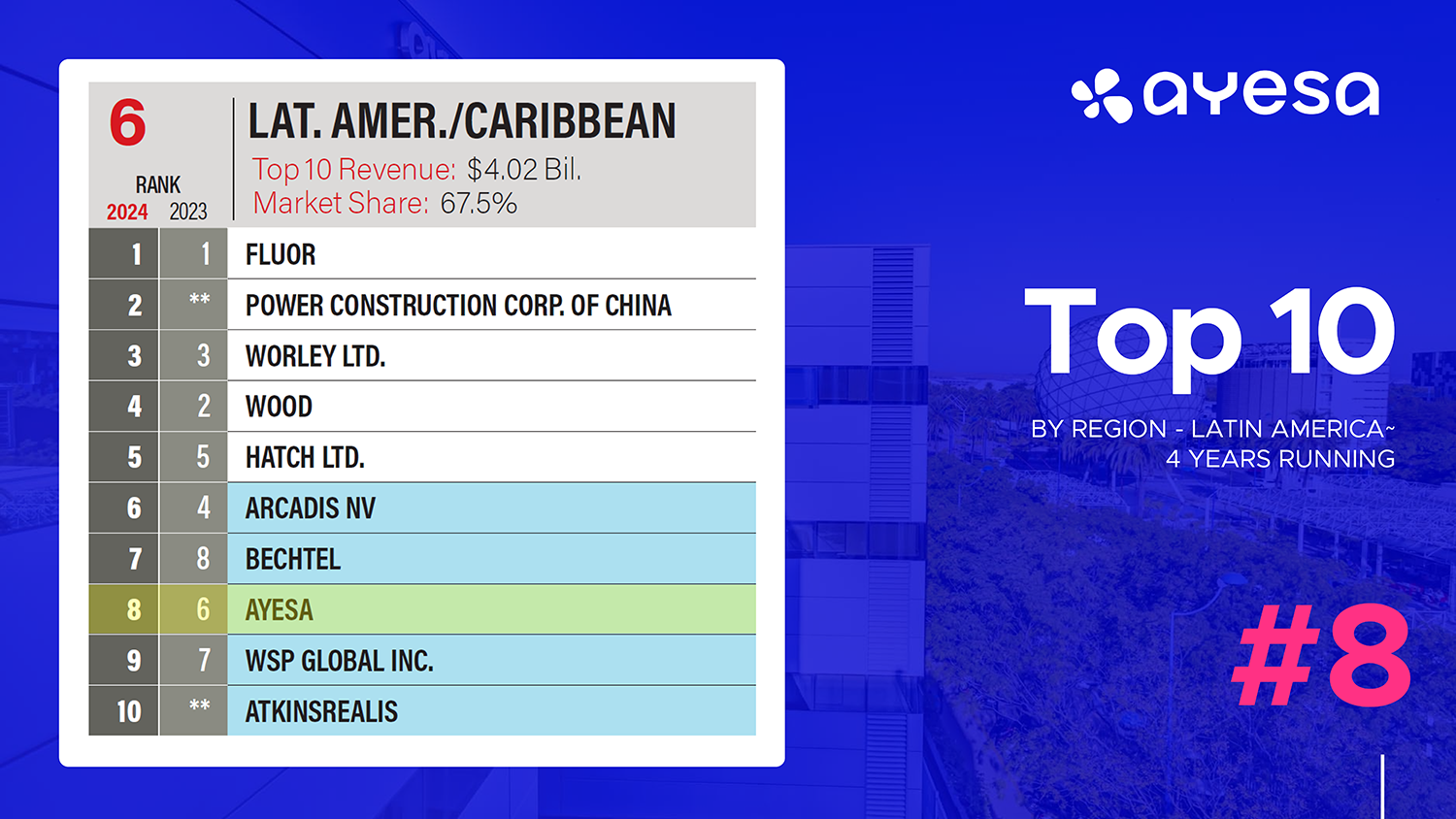 - Ayesa is ranked in Latin America’s Top 10 for four years. This region is valued at $4 billion (#8).