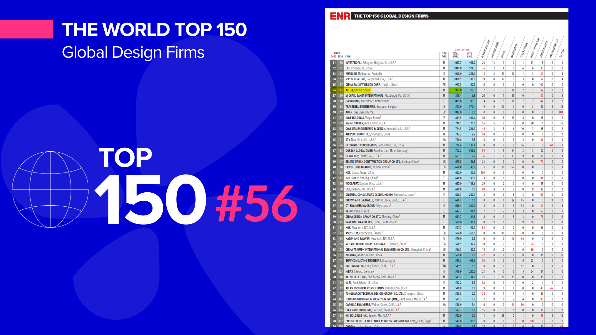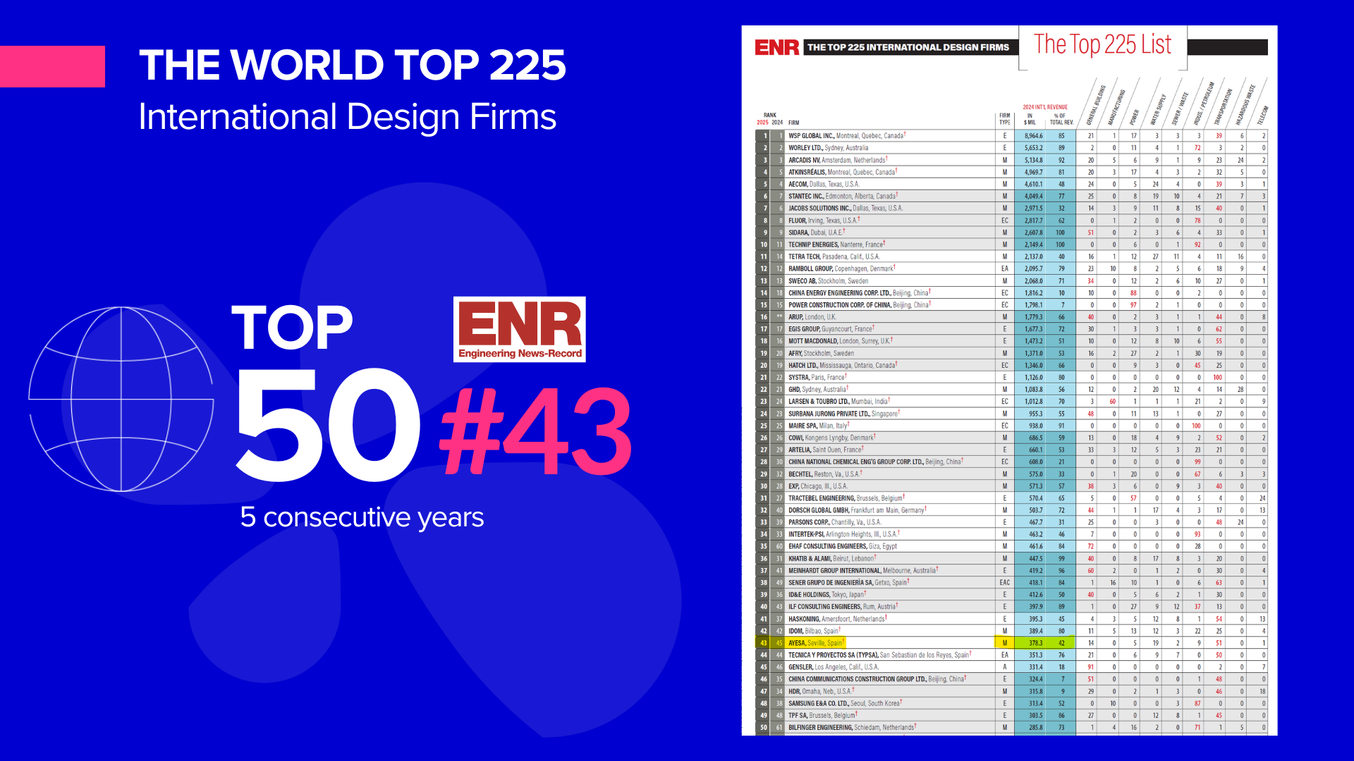 - #43 in the Top 225 International Design Firms: Ayesa Engineering marks five consecutive years in the World’s Top 50.