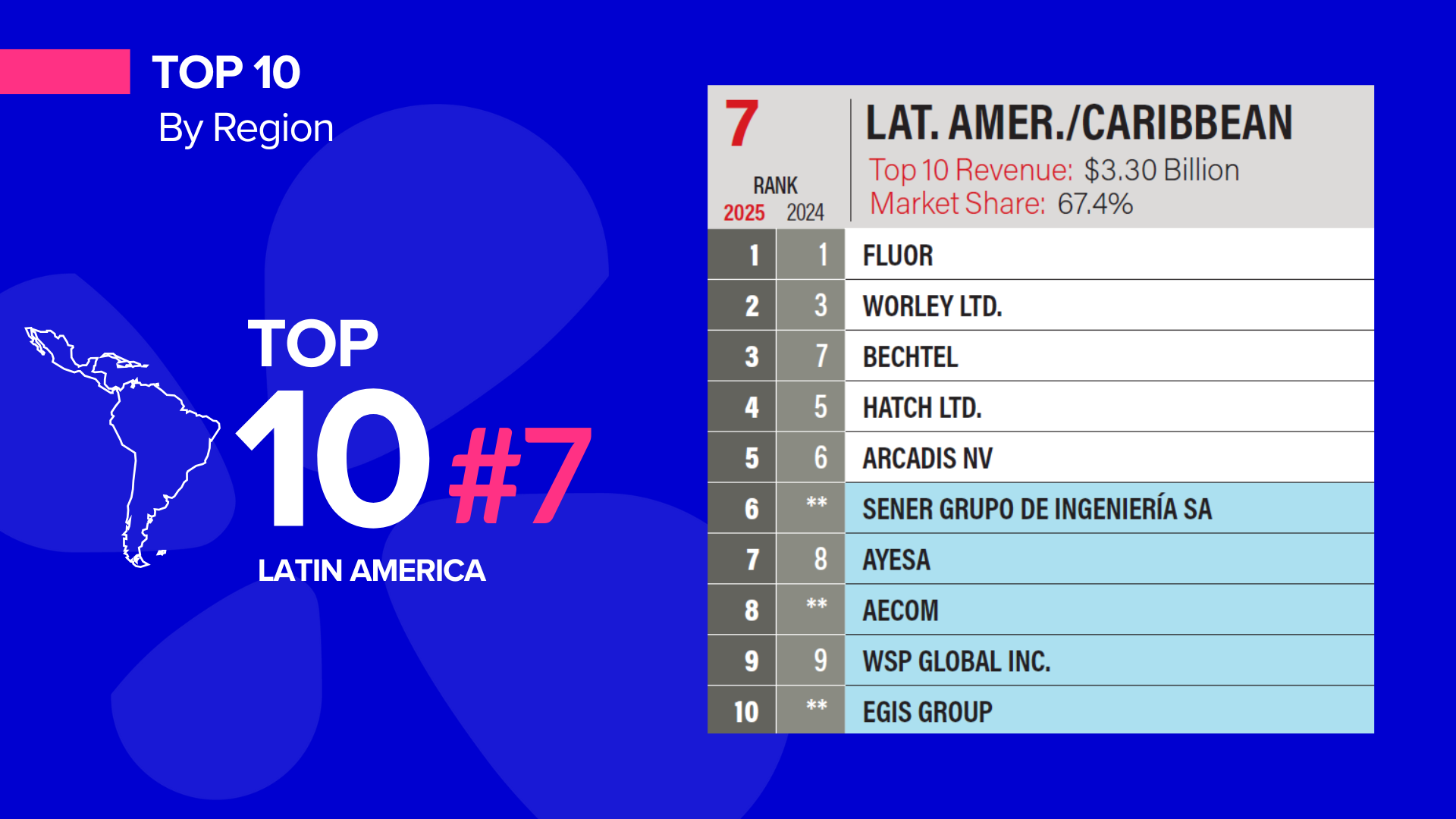 Ayesa continues to strengthen its position on the global engineering stage, as reflected in the latest Engineering News-Record (ENR) rankings. For the fifth consecutive year, the company is recognised among the World’s Top 50 International Design Firms and the Top 10 in Latin America, where it ranks #7 in a market worth $3.3 billion. Ayesa has also advanced in the ENR Top 150 Global Design Firms, climbing five places to #56 in 2025.