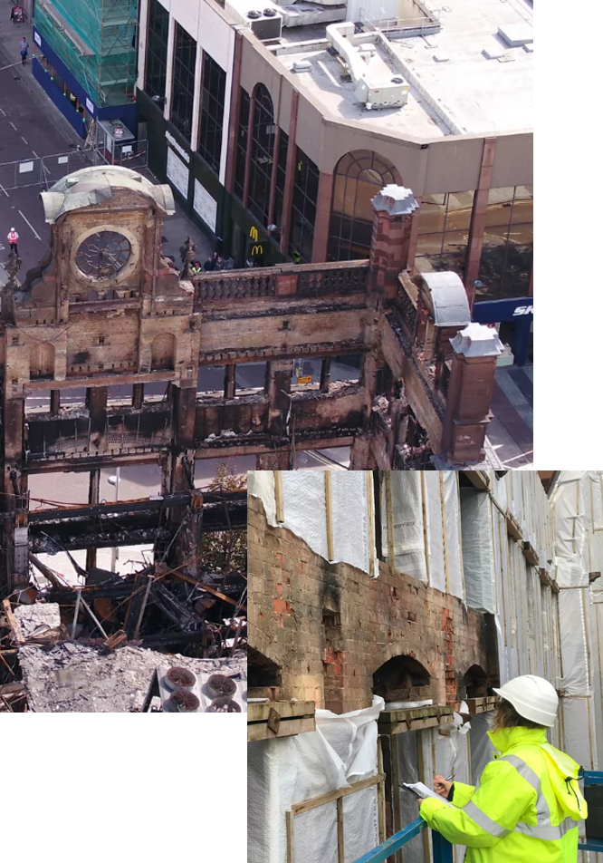 As access to the building improved, our team conducted thorough inspections of the remaining structure. Through meticulous testing and investigations, we gathered essential data that informed the detailed design of the necessary repairs and strengthening efforts. These investigations confirmed that the masonry backing structure of the facade was structurally sound and that its iron elements were suitable for retention. These findings allowed us to maximize the preservation of viable historic fabric, accelerating the statutory consent process and facilitating a targeted repair program rather than a full demolition and reconstruction. Ayesa Engineering developed detailed methods to strengthen the most at-risk areas, remediate structural damage from the fire and previous interventions, and support the overall recovery of this landmark structure.