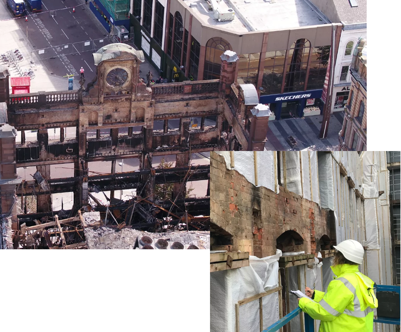 After the fire at Belfast’s Bank Buildings, Primark engaged Ayesa Engineering and our team of CARE Accredited Engineers to provide specialist conservation engineering services. Our responsibilities included structural conservation engineering, conducting condition surveys, and crafting detailed designs for the historic stonework, brickwork, and metal components (cast iron, wrought iron, and early steel). Additionally, we guided temporary works and managed ongoing testing, investigations, and monitoring.