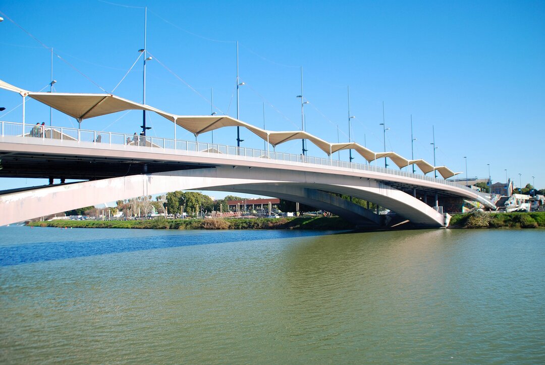The bridge was finished in 1991 and has boxes to house the water supply pipes, telecommunications, and energy supply for the city. The arches rest on cut enclosures of 600 square meters and 22 meters deep built on the blue marshes of the Guadalquivir River. The deck, located outside the arch, is supported by reinforced concrete and is used as a control and service registration area for the bridge.