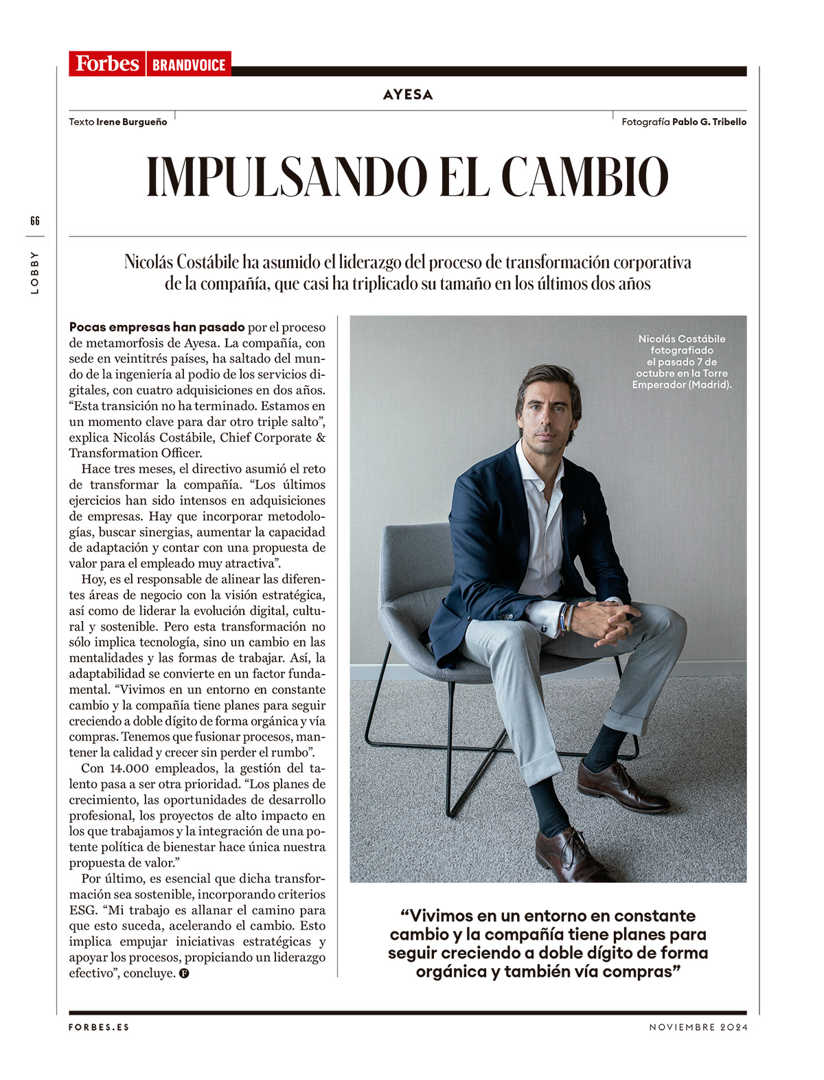 Pocas empresas han pasado por el proceso de metamorfosis de Ayesa Engineering. La compañía, con sede en veintitrés países, ha saltado del mundo de la ingeniería al podio de los servicios digitales, con cuatro adquisiciones en dos años. “Esta transición no ha terminado. Estamos en un momento clave para dar otro triple salto”, explica Nicolás Costábile, Chief Corporate & Transformation Officer.