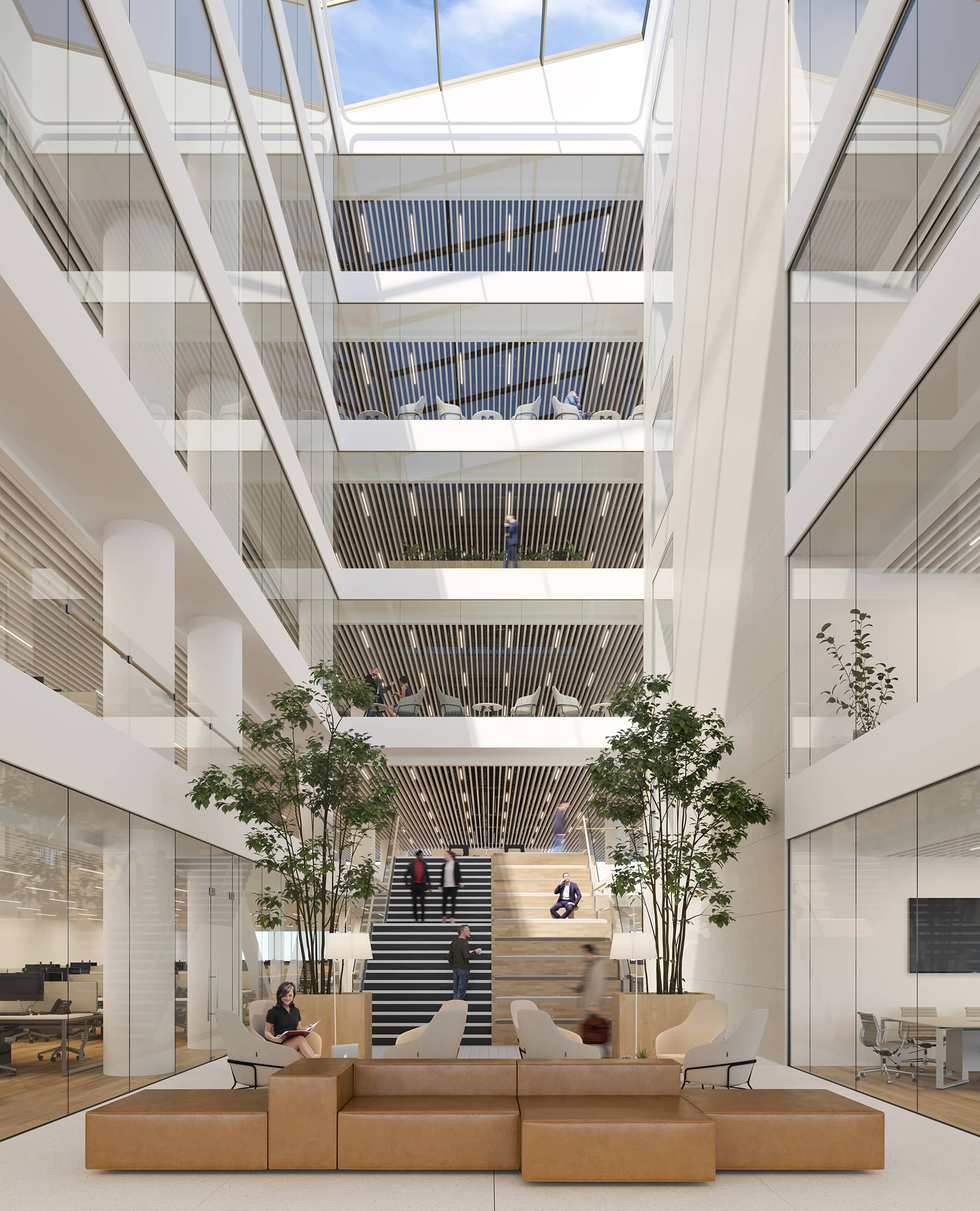 El edificio cuenta con siete pisos sobre el nivel del suelo y un sótano de dos niveles con un atrio central luminoso, incluyendo estacionamiento subterráneo y servicios.